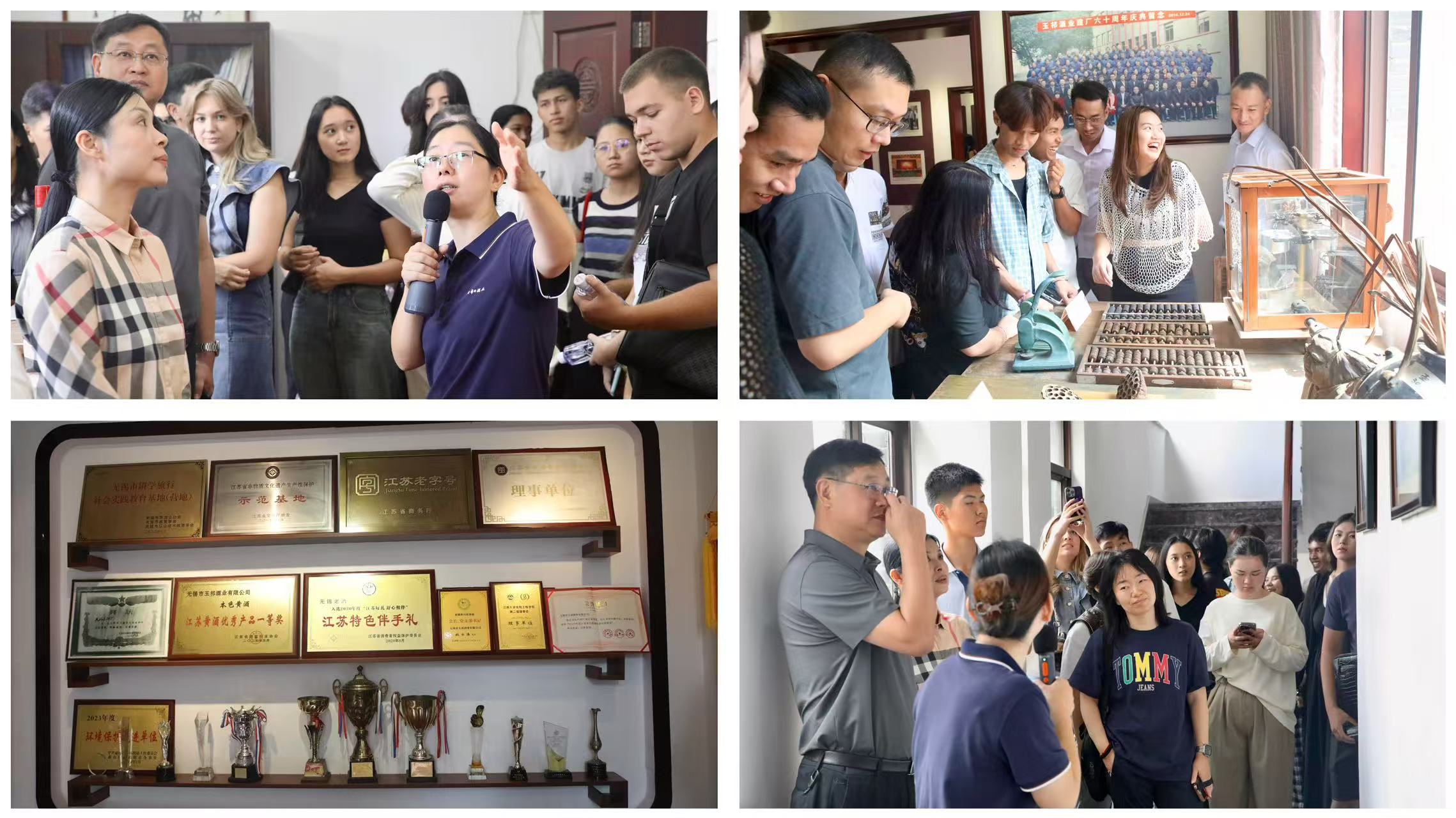再往里走,墻上掛滿的榮譽獎牌、證書格外醒目 —— 從行業認證到地方嘉獎,每一份榮譽背后,都是玉祁酒業一代代人堅守與努力的見證。而展區內陳列的精美定制瓶身,更是讓留學生們眼前一亮:有的融入江南園林元素,有的印有傳統吉祥圖案,獨特的設計風格引得大家紛紛拿起瓶身仔細端詳,拍照留念,感受中國傳統美學與酒文化的完美融合。