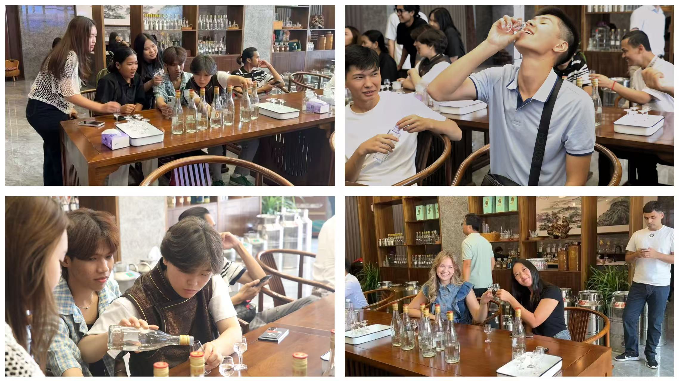 活動的最后一站,來到了江南醬酒酒體設計品鑒中心。大家先共同觀看了江南醬酒的宣傳片,從水源、原料到釀造工藝,全方位了解了這款酒的 “誕生故事”。隨后,在工作人員的指導下,留學生們拿起酒杯,輕嗅酒香,慢品佳釀,感受江南醬酒醇厚綿柔的獨特口感。
